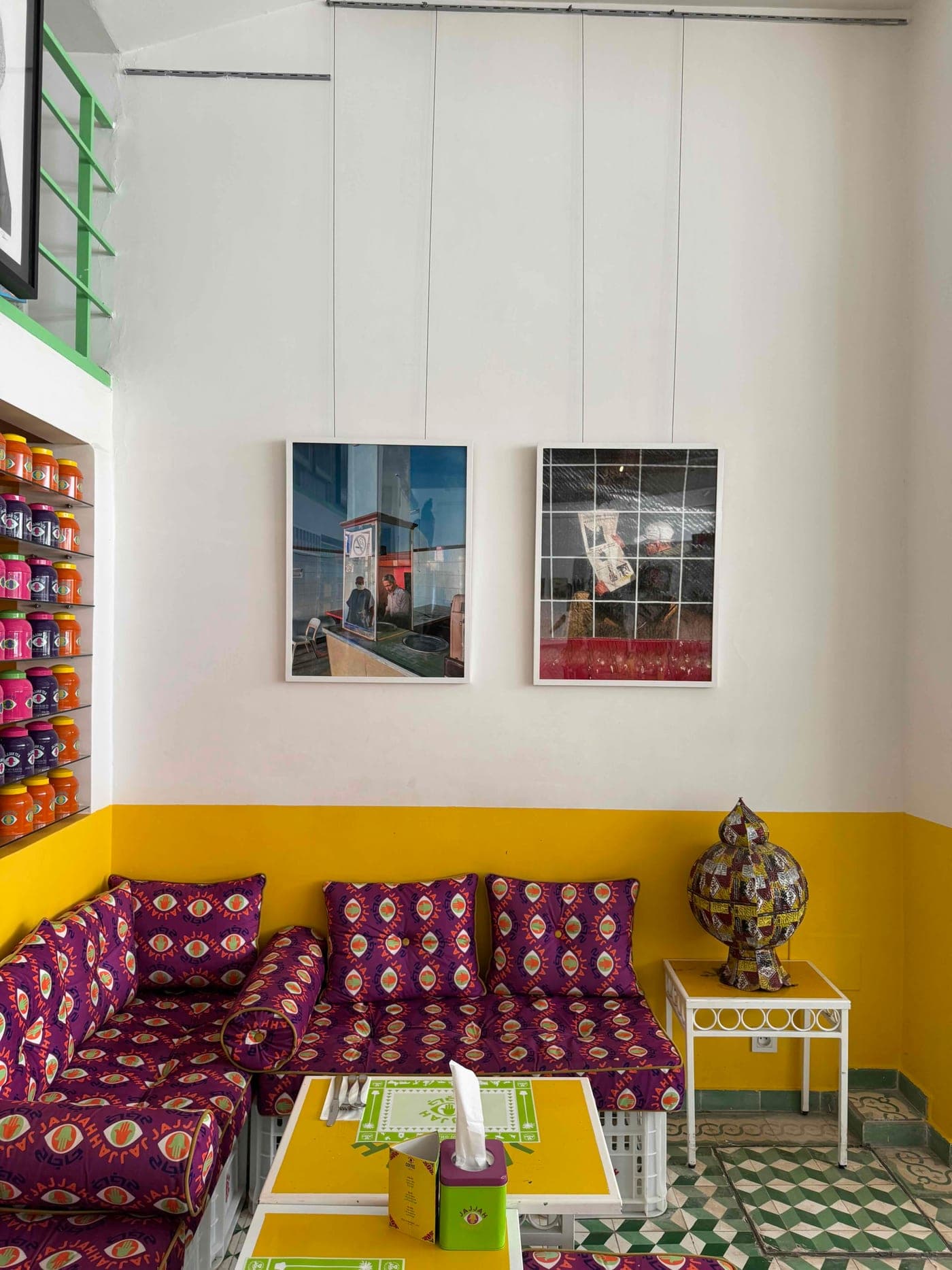 Jajjah is his name spelled backward, and also the name of both his tea brand and the concept space he opened at 114-116 Rue Sidi Ghanem. The space operates simultaneously as cafe, boutique, and gallery: tea is brewed, Moroccan food is served in Hajjaj's visual language, objects and prints are sold, and exhibitions rotate through the gallery section. A recent collaboration with Atay Atelier, the "Cross Lens" exhibition, brought together eight emerging artists from Morocco and the Netherlands to address cultural identity through photography, which is as clear an illustration as any of how Hajjaj uses the space: as a platform for the kind of international artistic exchange that shaped his own practice in its early years.