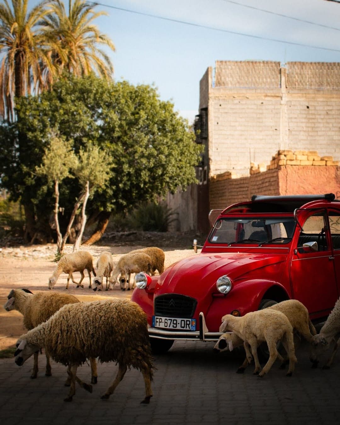 Moving through the medina in a 2CV produces a specific kind of visibility: you are in something recognisably out of place, which means the street notices you and you notice the street in return. The Palmeraie at dusk from a 2CV is a different proposition from the Palmeraie seen through a tour bus window. The scale is right. The pace is right. The colour is usually red or yellow, which helps.