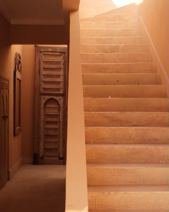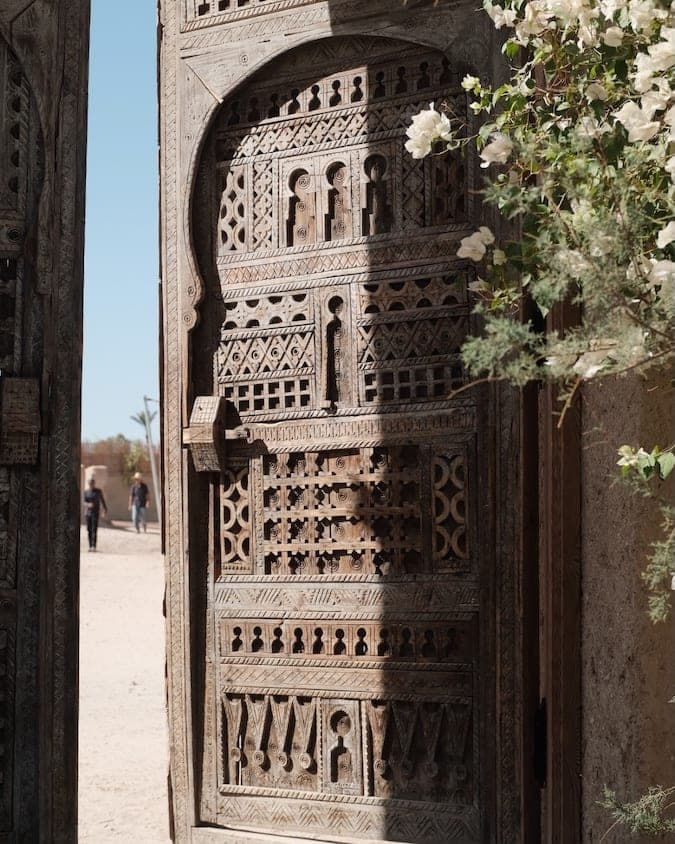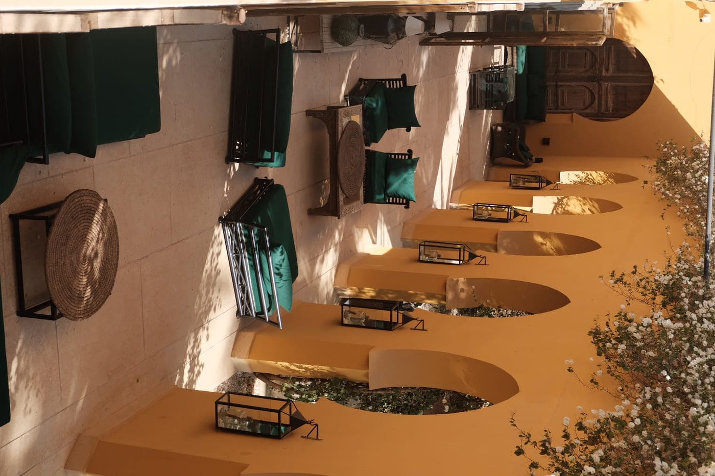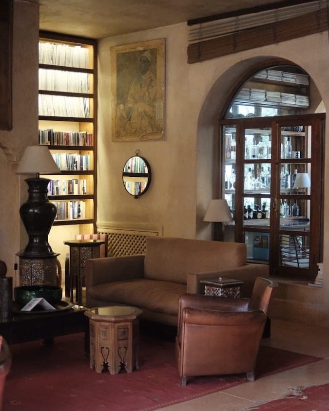 The interiors mix Oriental, African, and European influences in a way that feels earned rather than assembled for effect. Textures accumulate naturally, clay renders beside carved wood, rugs sit on tiled floors, and light enters through arched windows in ways that suggest the architecture was designed to control it carefully. Twenty-four bedrooms distribute across the five houses, each room shaped by its particular position in the building and its relationship to the light outside.