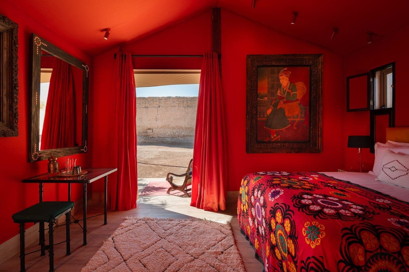 The Punjab Tent is anchored in deep red tones and large portraits of Indian figures in traditional dress. The bed is laid with an authentic Suzani, the Central Asian embroidered textile that found its way into Mughal interiors across the Subcontinent; the headboard is upholstered in Indian silk Meryanne sourced directly in Jaisalmer. Inlaid side tables carry an unmistakably Indian character. In the bathroom, celadon green marble and copper details evoke the atmosphere of a refined hunting camp, the kind where a Maharaja might have expected both wilderness and comfort.