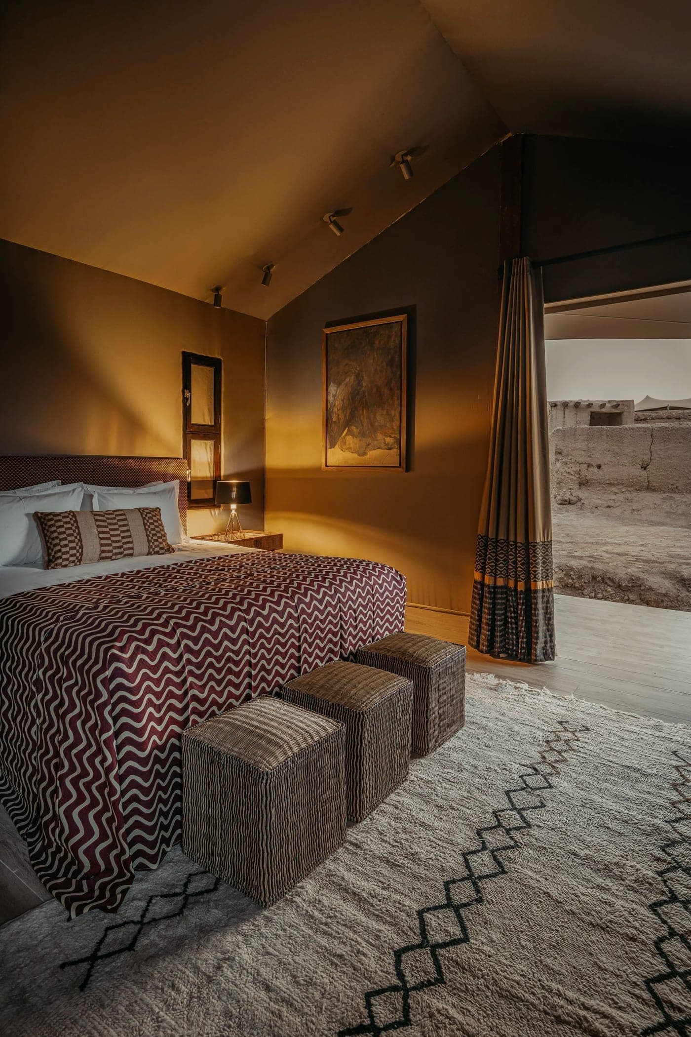 Each tent carries its own geography. Meryanne drew from three distinct zones along the historic caravan routes, India, sub-Saharan Africa, and the Saharan corridors, and treated each space as a separate chapter in the same larger story.