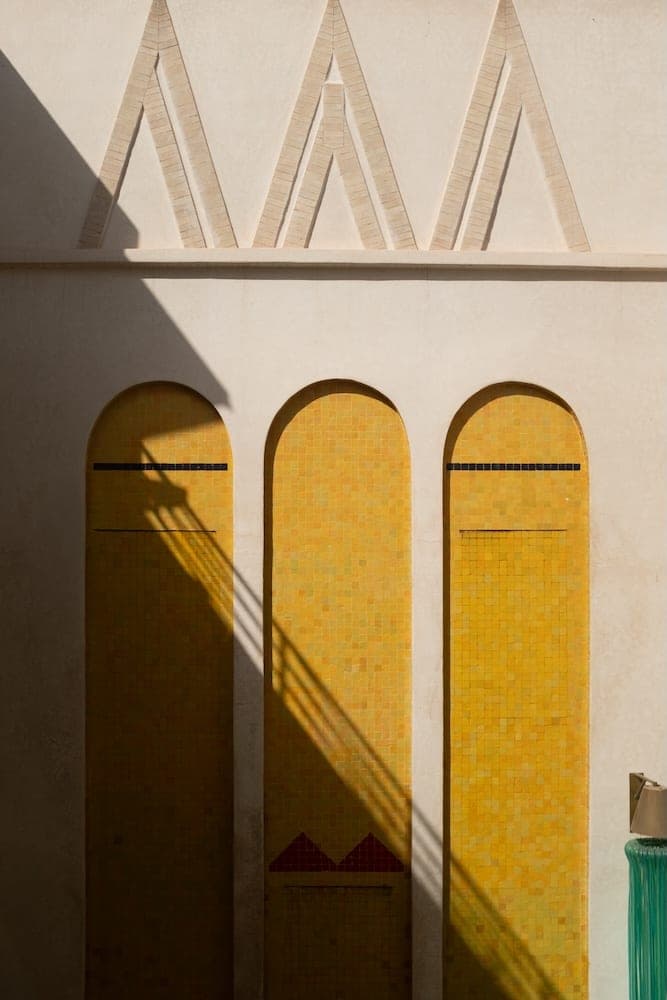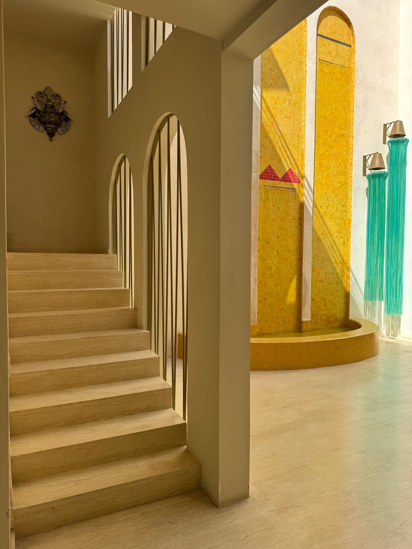 The courtyard anchors the property. Three stories of the riad rise around it, and at its center sits a fountain of Gigli's own design, below a set of octopus-shaped yellow chandeliers created by his longtime collaborator, Italian artist and designer Jacopo Foggini. Over the stairway, Foggini also produced an orange-and-gold dewdrop installation that hangs across the vertical space with the precise looseness of something natural and engineered simultaneously. A glimmering waterfall sculpture fills the three-story courtyard with light that changes as the day progresses.