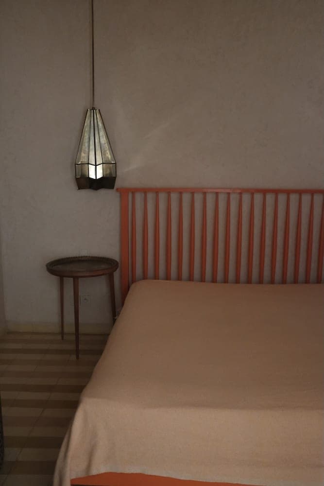 The five accommodations, three rooms and two suites, each maintain the same design intelligence without repeating themselves. The handwoven cotton bedspreads came from Rabat, chosen for their weight and texture rather than as decorative statement. The color choices across the rooms respond to the particular quality of light that enters each space at different hours of the day. There is nothing generic in any of the five interiors; each one feels like a considered decision made by someone who knew exactly what that room needed to be.